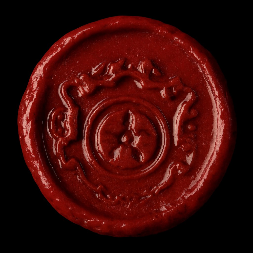 (Handtekening van Arnold Langemann en daarnaast zijn persoonlijke zegel, afkomstig van een persoonlijke (niet-ambtelijke) brief van 1587. Het zegel toont een 5 spaaks wagenwiel op een zogenaamd renaissance-wapenschild. Het gaat hier "zonder twijfel" om het persoonlijke zegel en niet om het wapenbeeld van het bisdom Osnabrück, aldus het Nedersaksisch Landsarchief Hannover namens het bisdomsarchief Osnabrück. De lakzegel zelf was onherkenbaar beschadigd, maar het zegel was gelukkig in het papier doorgedrukt, zodat het toch nog herkenbaar is gebleven. Deze afbeelding is bewerkt. Het origineel is namelijk perkamentkleurig. Doorsnede: 1,4 cm.)