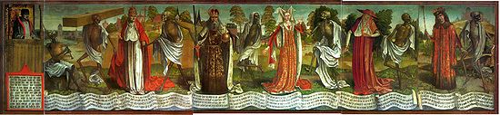 During the 300 years which followed, the Langmanns became well-to-do burghers in Nurnberg, merchants and manufacturers, holding down the offices of senators and ministeriale. They married into other leading families, notably the Ebners, the Behaims, the Pfinzings and the Eysvogels. Besides being civic leaders they also became leaders in the church, and to the left is a picture of the 'Eysvogel/Fuerer Fenster', a painted window dating from about 1379 in the St.Sebaldus church that remains to this very day. This shows just above the window sill the Langmann coat-of-arms beneath and besides those of Christian and Sigmund 'den Ellter' Fuerer von Haimendorf, Eysvogel, Pfinzing and Ebner. Then, in the mid-1300s, there was a great expansion towards the sparsely populated north, and the Langmenn who already had well-established trading outlets in the outermost corners of the empire and beyond, decided to pull up stakes. By this time the family had grown in size, and some went west and northwest to the Rhineland and the rapidly expanding cities of Muenster, Hamburg and even London, and to Bergen in Norway. Others, and among these my forefathers, decided to head northeast. Hans (or Johann) Langmann, who was born in Nurnberg in about 1280 went with the Deutsche Ritterschaft Order (Teutonic Knights) to Livland (Estonia) and from there reestablished himself as a Hanse merchant further south on the Baltic coast in the prospering city of Rostock. On a trip back north to Riga he fell ill and died, some time after the year 1357. His son, Heinrich Nicolaus de Langmann was by then already a very well off merchant in the free imperial city of Rostock, and in 1370 he resided at Muehlentor in Lubeck. Among his descendants were city officials, deans and teachers. The family put down roots in Mecklenburg and Altmark where a great many of its members became educators and ministers of the church. They studied law, medicine and divinity at the universities in Rostock, Greifswald and Koenigsberg, and some went on to continue the profitable merchandising trade while a few became soldiers who fought in the frequent smaller feuds and wars that went through the land. Like their forebears in Nurnberg they were quick to adopt the new faith as it was presented by Martin Luther in 1517 when he nailed his 95 theses to the door of the castle church in Wittenberg. A hundred years later, in 1618, two imperial governors along with their secretary were thrown out of the window of the castle in Prague, landing ignomously in a manure pile, and that was the beginning of the 30-year-war. Hired troops from every corner of the European continent and in particular from Protestant France, Denmark and Sweden clashed with the army of the Catholic emperor in Vienna, marching through the German states pillaging, raping and burning whole cities and towns to the ground, leaving nothing but devastation in their wake. Mecklenburg was particularly hard hit, as was the Rhineland by the French Landsknecht mercenary troops. A series of summer droughts and particularly harsh winters and several outbreaks of the bubonic plague also took their toll among those who managed to survive the hostilities. In Mecklenburg it is estimated that more than 50 percent of the population died. The greater part of neighboring Denmark was occupied by first Austrian and then Swedish troops and the population here suffered greatly, thereby severely impacting on business and trade in the Baltic region. The Grim Reaper danced through the lands making no distinction between rich and poor as can be seen in this 'Totentanz' (Dance Macabre) medieval painting (from St.Nicholas church in Tallinn):
